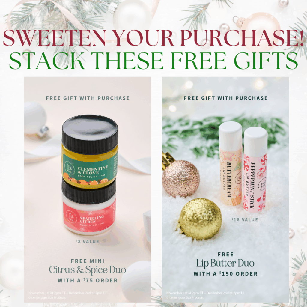 Enjoy a free mini citrus and spice duo with your purchase of $75 or more! Includes 1oz Clementine and Clove Body Polish and 1 oz Sparkling Citrus Body Icing.