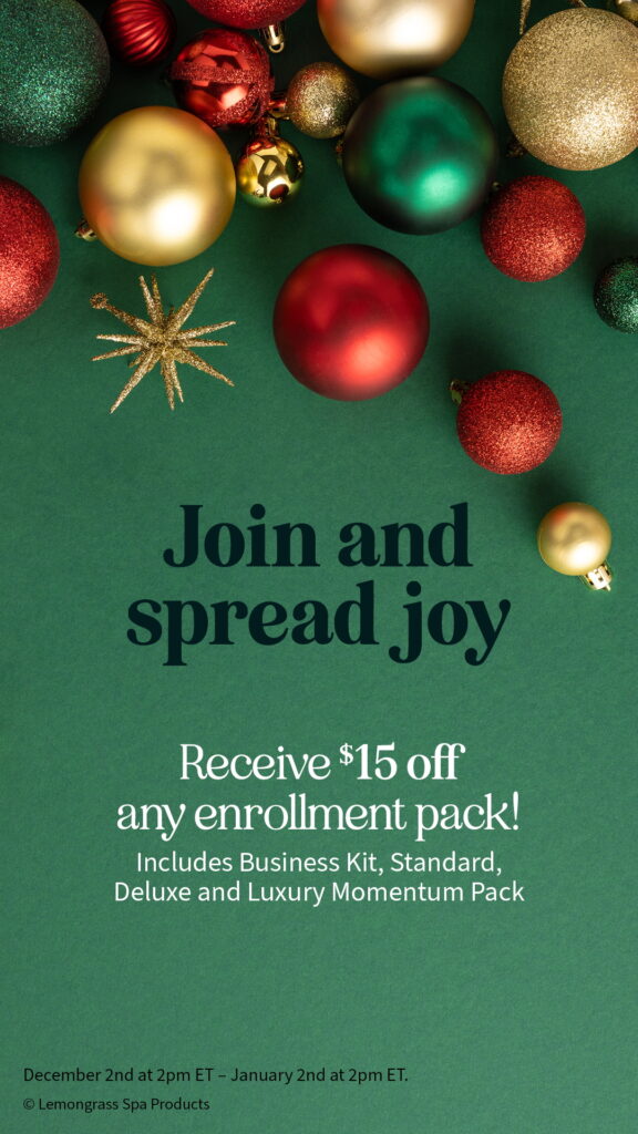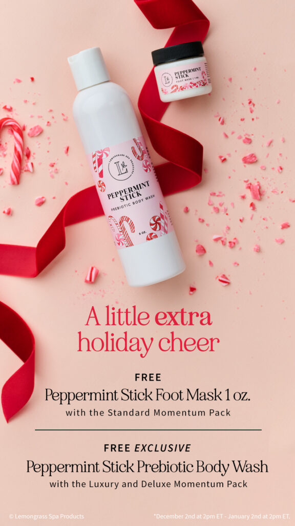 Join us this month and enjoy $15 off any enrollment pack! Plus you’ll receive extra holiday cheer! Our Mini Peppermint Stick Foot Mask is tucked into the Standard Momentum pack and our Mini Peppermint Stick Foot Mask and 8oz body wash are included with our Luxury and Deluxe Momentum packs!