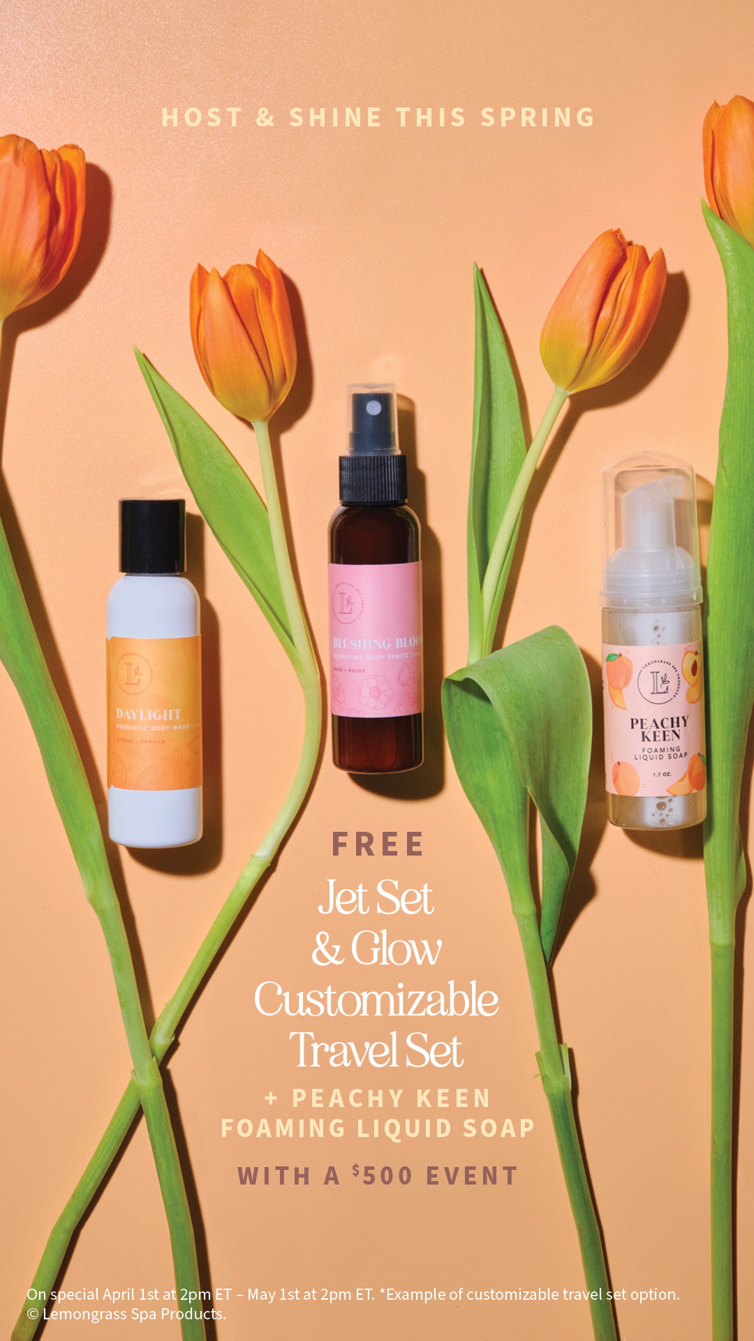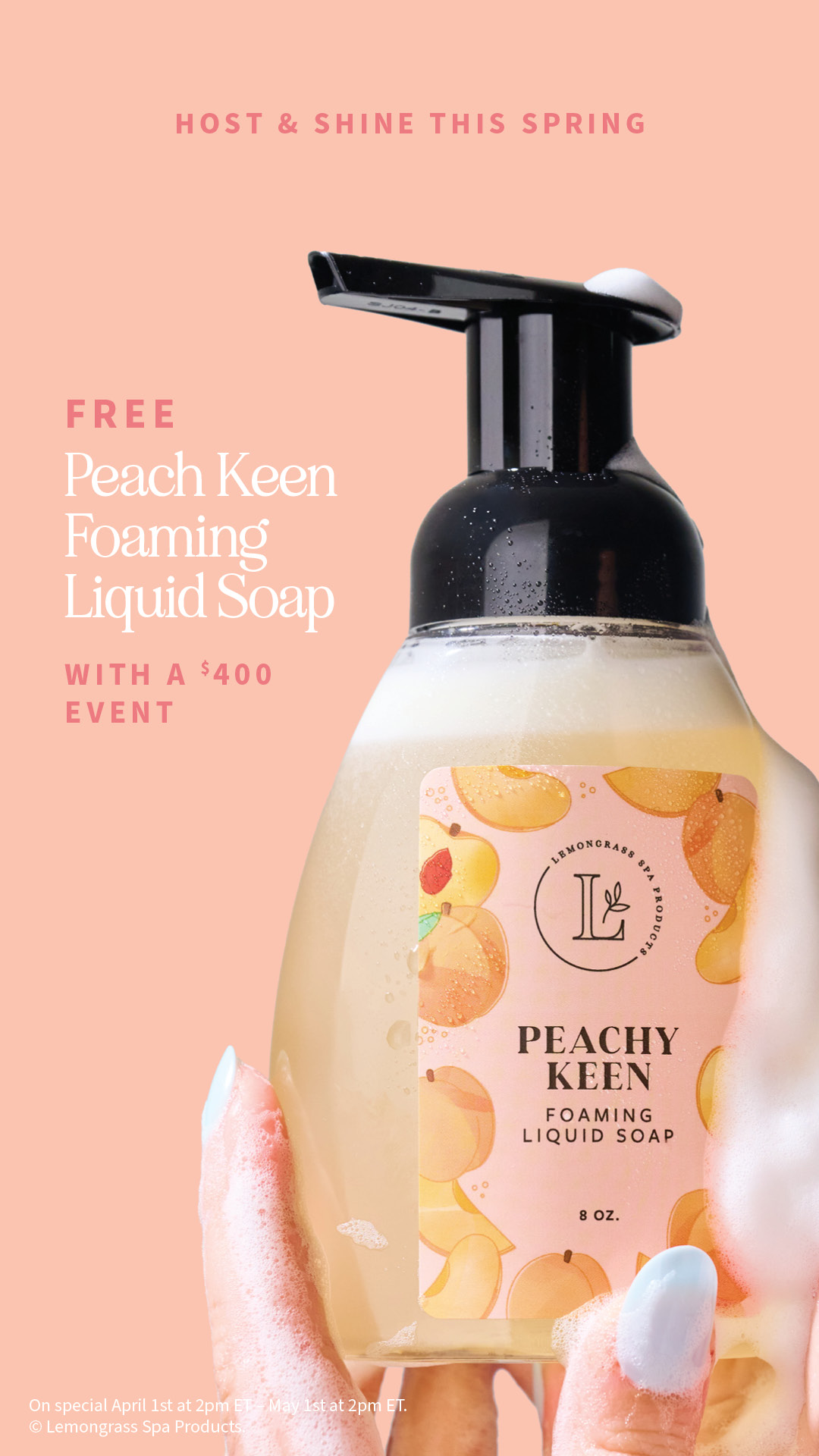 This month you have the opportunity to receive our popular Peachy Keen Foaming Hand Soap and our limited edition Jet Set and Glow Set as extra free gifts! That is in addition to our other host rewards of shopping cash and half price items for products of your choice!